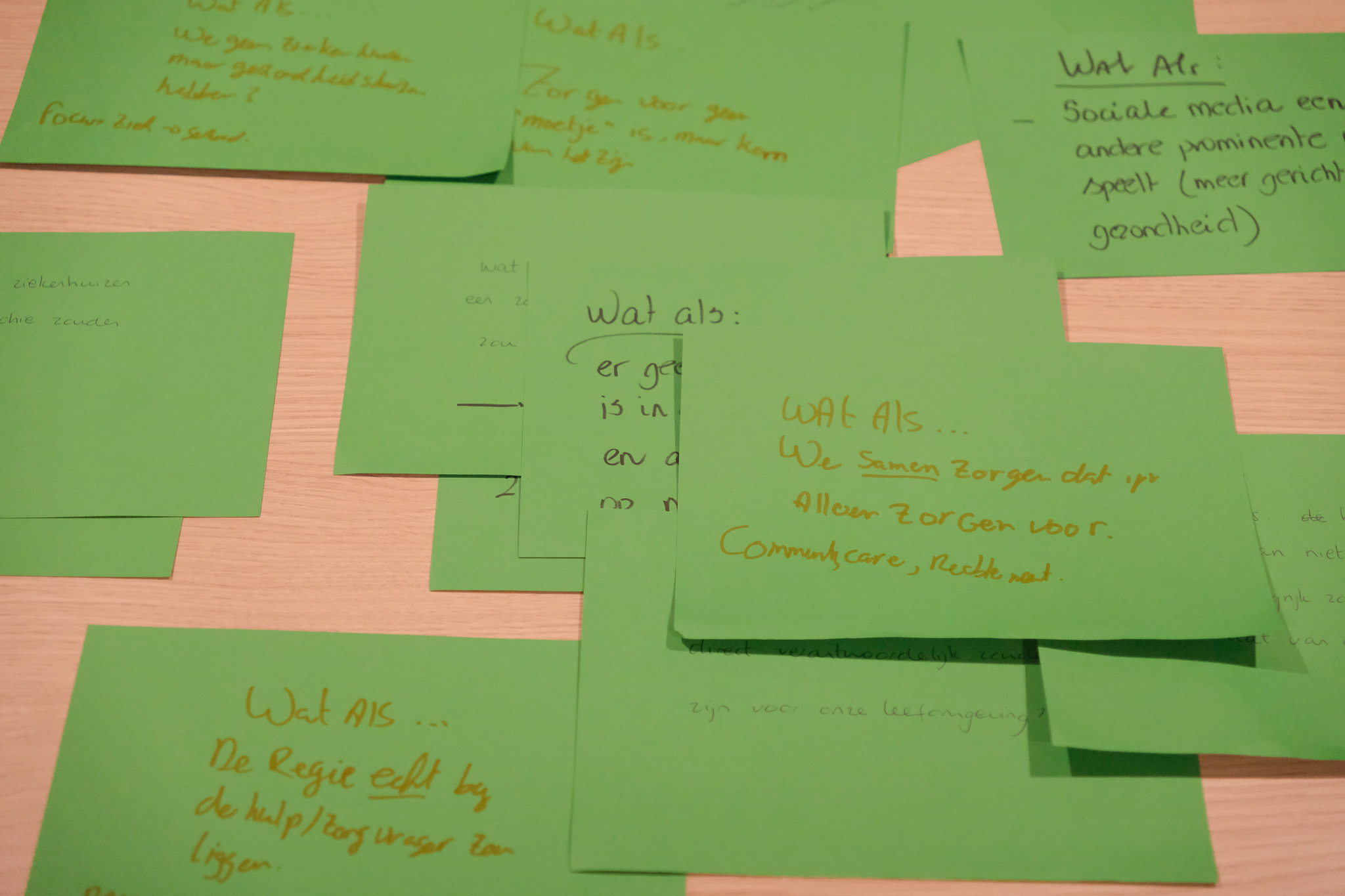 Eenmaal onthaast, verzamelden we in de eerste ronde wat-als statements en gingen we in kleine groepen de dialoog aan over wat voor toekomsten we in de zorg voor ons zien. Hier een kleine greep: